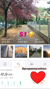 - 4ème sortie: J’étais super contente, c’était la première fois de ma vie que je fais autant de bornes la même semaine : 42 Km, un marathon quoi!