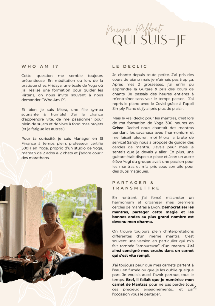 Il est enfin lĂ ! Jâai toujours peur que mes carnets partent Ă lâeau, en fumĂ©e ou que je les oublie quelque part. Alors j’ai consignĂ© mes 45 mantras coup de cĆur avec leurs accords pour les partager et te guider pas Ă pas. Tu vas pouvoir apprendre Ă chanter, jouer et ressentir la magie des chants de mantras avec ce carnet unique đ€©.